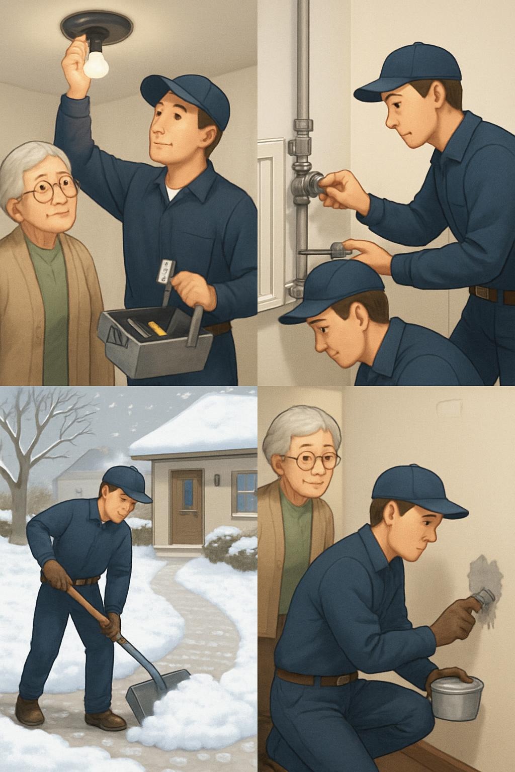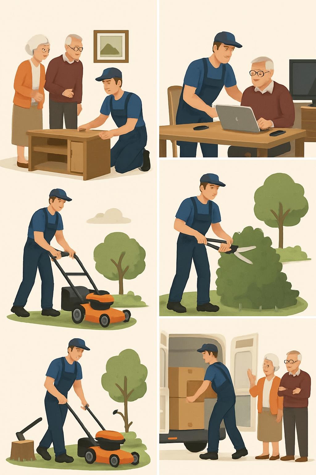 Från teknisk hjälp till snöskottning och matlagning. Jag hjälper till med det som inte hinns med eller klaras av.